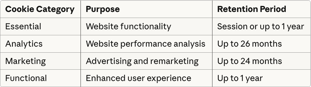 - Analytics data: Retained for up to 26 months in compliance with GDPR